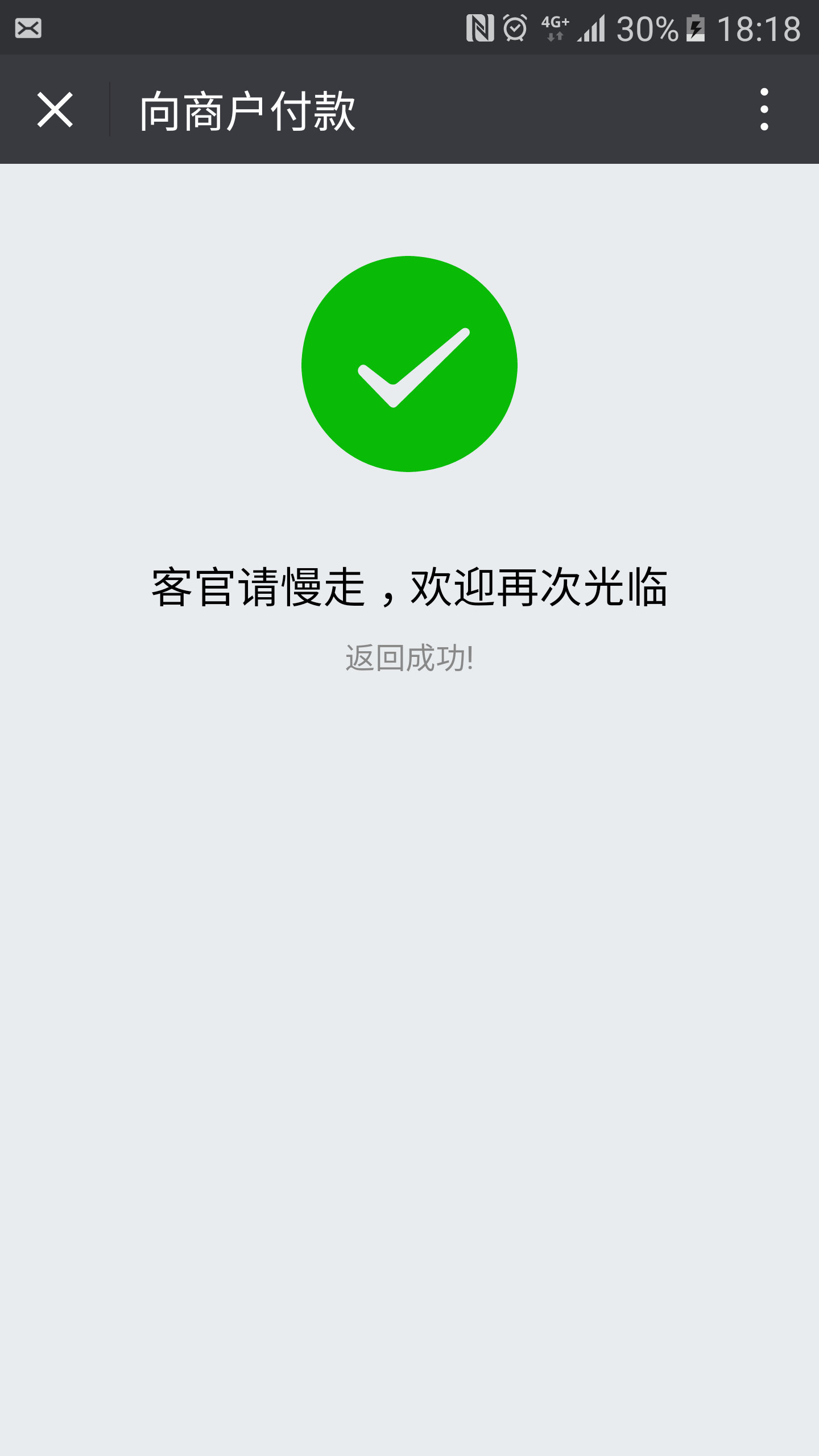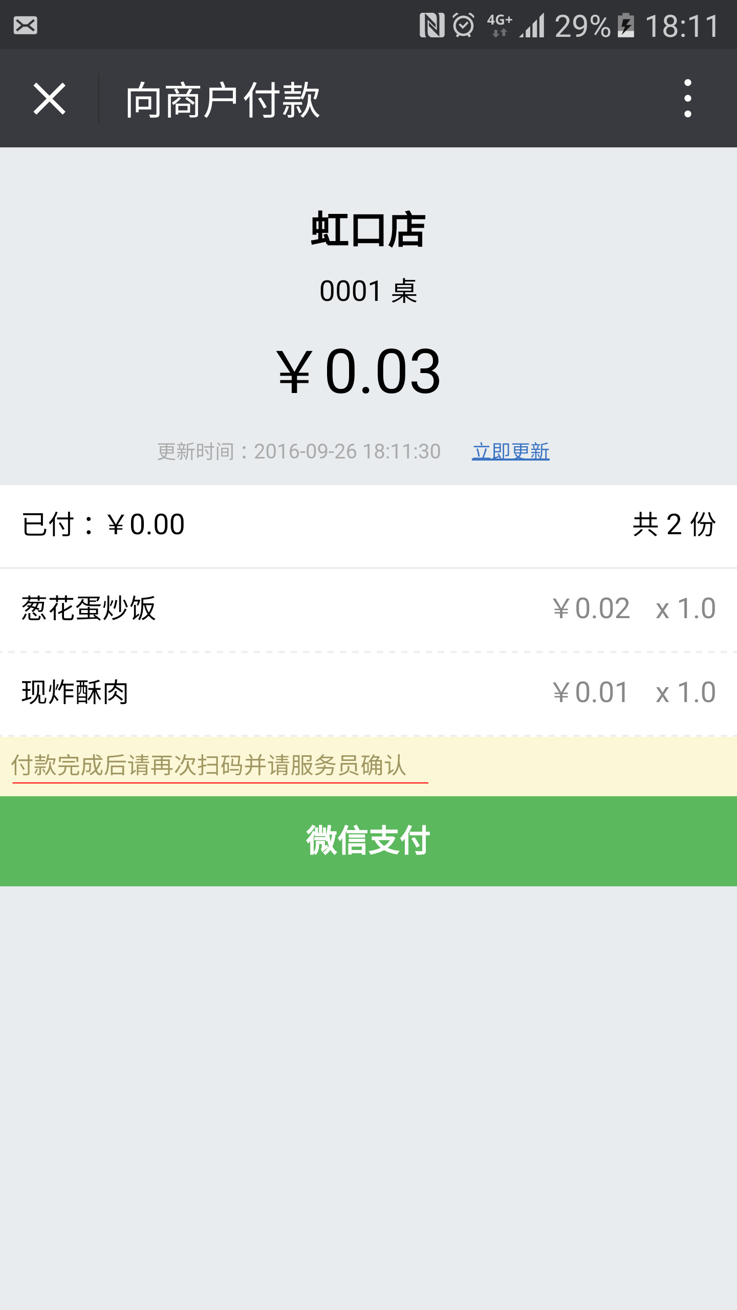 確認(rèn)無(wú)誤后可直接支付。 付款完成后,廚客或服務(wù)員可再次掃碼,進(jìn)入結(jié)賬確認(rèn)頁(yè)。
