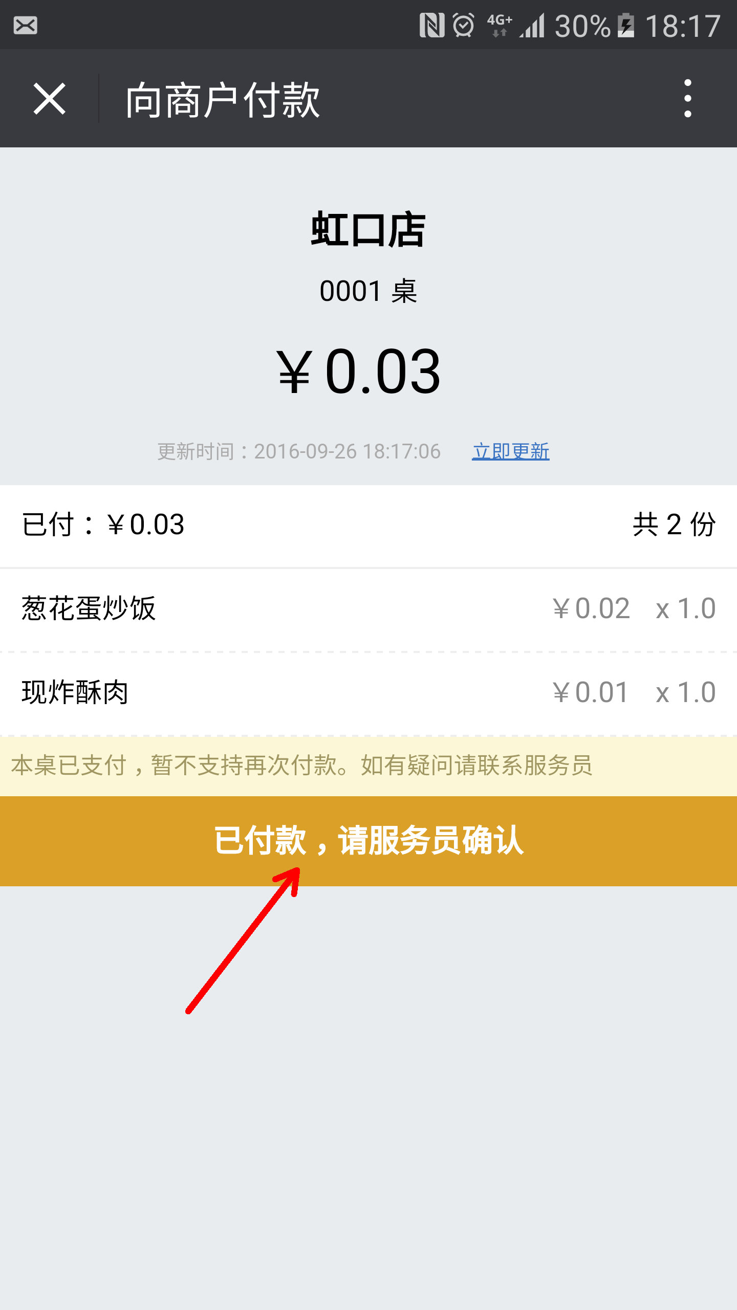 3、確認(rèn)結(jié)賬 - 顧客付好款后,呼叫服務(wù)員。服務(wù)員或顧客掃碼實(shí)時(shí)看到買(mǎi)單情況。