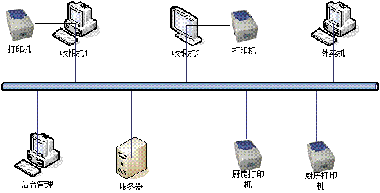 ? 收銀機:主要完成營業(yè)功能,包括點菜、收銀、打印賬單,具體機器選型則可根據(jù)具體情況而定,可以選擇普通PC,可以選擇觸摸屏。