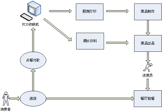 ? 點菜消費:顧客進店后,首先來到收銀臺選擇將要消費的菜品,確定后,馬上進行付款操作,系統(tǒng)同時打印出結(jié)賬單作為消費憑證。與此同系統(tǒng)還需進行所點菜品的廚房分單打印,打印到指定廚房打印機上,顧客則自選餐桌就座等候。